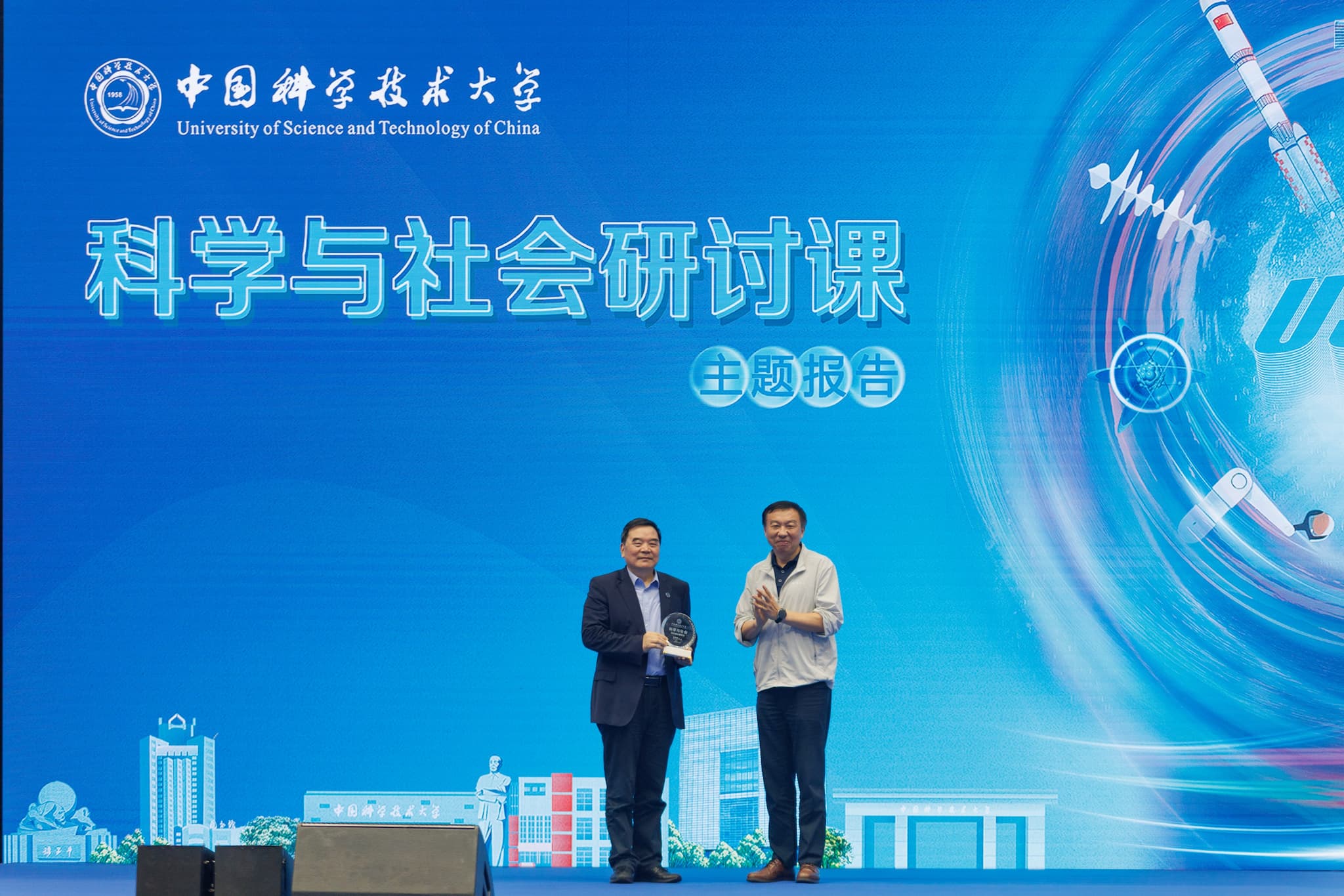 报告尾声,舒歌群代表学校向包信和颁发了“科学与社会”研讨课主题报告纪念牌。