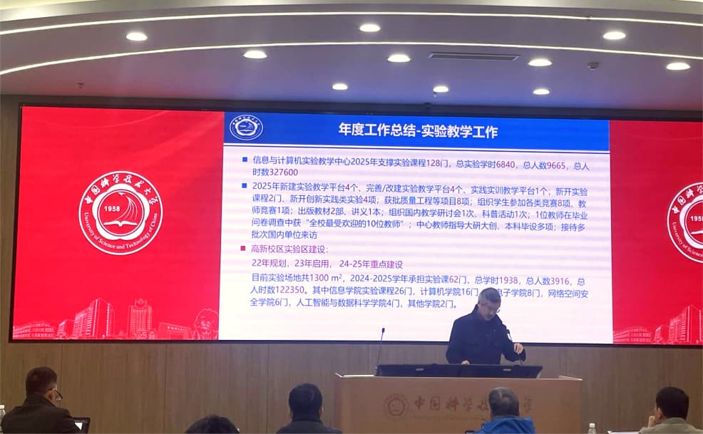 会上,各实验教学中心负责人围绕 2025 年度工作成效,从仪器设备采购与使用、实验教学平台搭建、课程体系优化、人才培养成果、教学研究与创新等多个维度,全面汇报了年度建设绩效,分享了特色鲜明的建设经验。同时,各中心负责人还详细介绍了针对上年度考核专家意见所采取的调整改进措施,展现了各中心持续优化建设工作的积极态度。