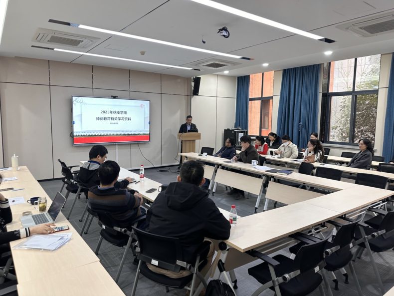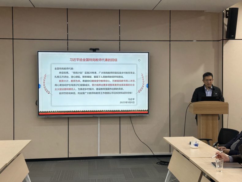 会上,全体人员系统学习了近期上级重要指导精神,具体包括《关于深入学习贯彻习近平总书记给全国特岗教师代表重要回信精神的通知》《教育部等六部门关于加强新时代高校教师队伍建设的指导意见》,以及习近平总书记给全国特岗教师代表、天津大学全体师生、中国农业大学全体师生的回信内容,深刻领会了党中央对教师队伍建设的战略部署与殷切期望。随后,会议重点解读了校党委印发的《中共中国科学技术大学委员会关于弘扬教育家精神和科学家精神 加强新时代高素质专业化教师队伍建设的实施方案》,进一步明确了学校在推动教师队伍建设方面的具体目标和实施路径。接着,武晓君同志结合中共中央、国务院《关于弘扬教育家精神加强新时代高素质专业化教师队伍建设的意见》,对“教育家精神”的内涵与时代意义进行了阐述。最后,全体教职工重温了《新时代高校教师职业行为十项准则》,再次强化了职业道德底线意识,明确了行为规范,筑牢了规范执教的思想根基。